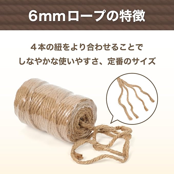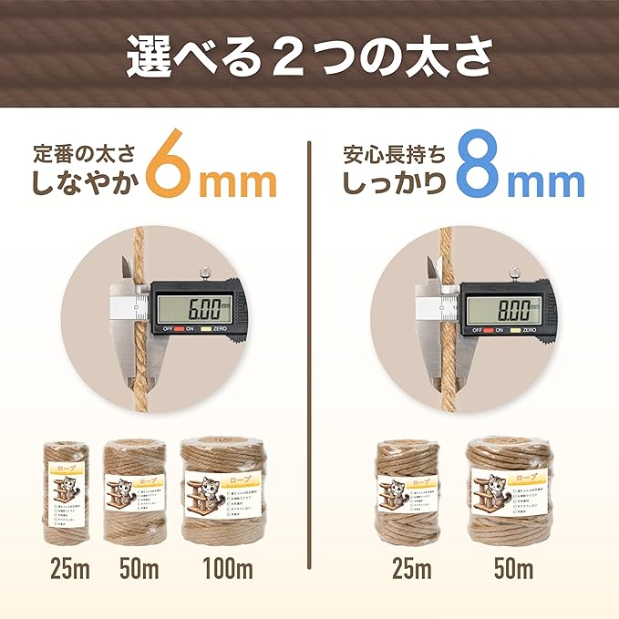 【選べる5タイプ&2サイズ展開】 ・6mm:25m/50m/100m ・8mm:25m/50m キャットタワーのサイズや本数に合わせて、必要な長さを選べます◎