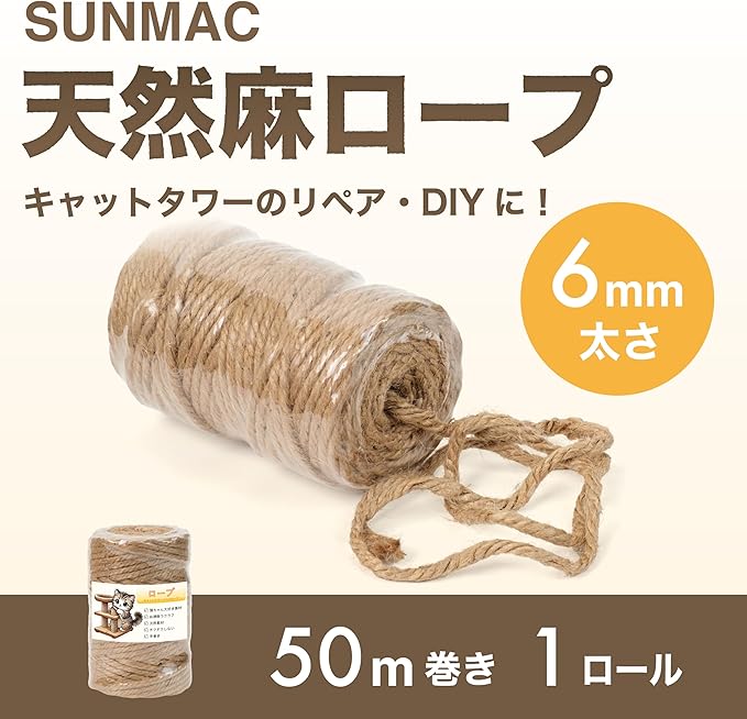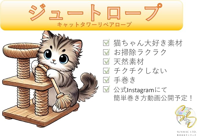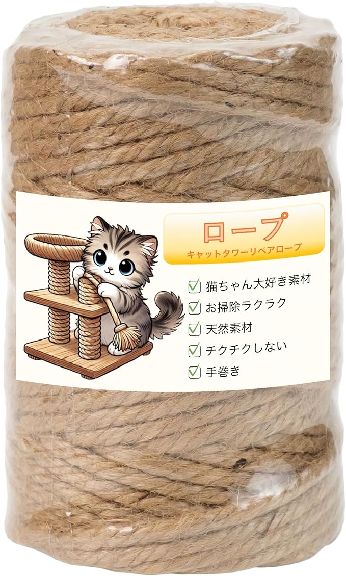 【猫にも環境にもやさしい、ジュートロープ】 バングラデシュ産ジュート100%の天然素材を使用した、キャットタワーのリペア用ロープです♻️ 猫ちゃんが大好きなジュートで、爪とぎタイムも快適に!環境にもやさしいエコ素材です。