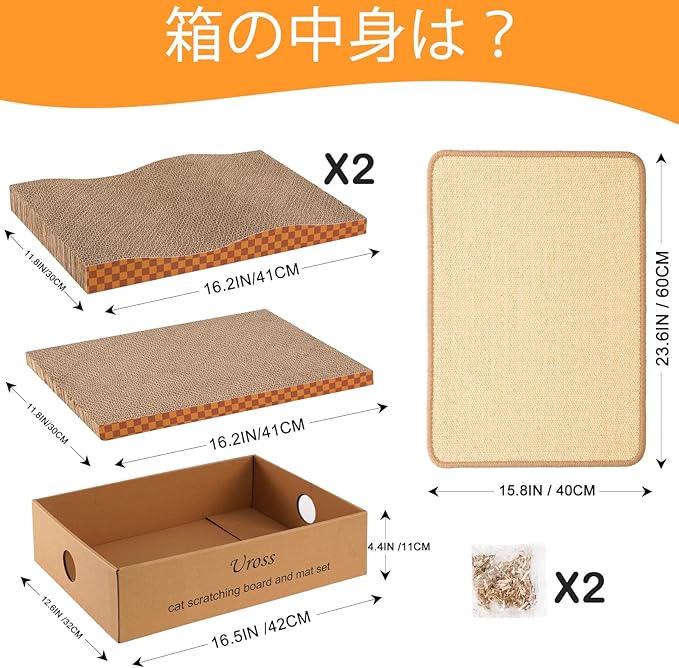【拡大サイズ】猫用スクラッチボードは 41CM x 30CM、猫用サイザル麻マットは60CM x 40CMです。あらゆるタイプの猫に適しており、猫が遊んだり休んだりできるスペースを広げます。