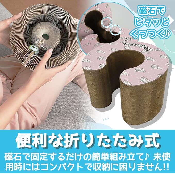 でピタッと固定できるため簡単に組み立てができる猫用段ボール爪とぎです。未使用時は部分を外すことで、コンパクトに収めることができ収納場所に困りません。
