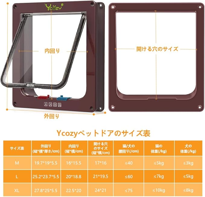 ご購入前のご注意:※本製品は、厚さ≤5cmである戸に設置できます。もし戸の厚さ≤2.0cmなら、超薄型の猫ドアをご購入下さい。寒い天気に扉の上の回転軸も凍ってしまって、 そこに少し油(低温でも固まらないタイプ)を差したら問題なく使えると思っております。インストールビデオ:https://youtu.be/VYO3x_NATIM。