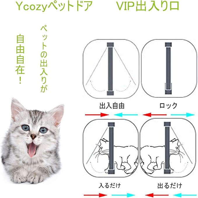 耐候性ブラシ:猫ドアのブラシが雨、風、雪の侵入を効果的に防ぎます。寒さを防ぎ、暖かさを保ちます。通過後も騒音を防止します!バルブの横にがついており、猫が通るとドアが自動に元に戻ります。