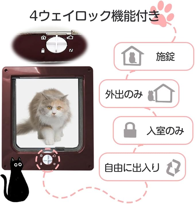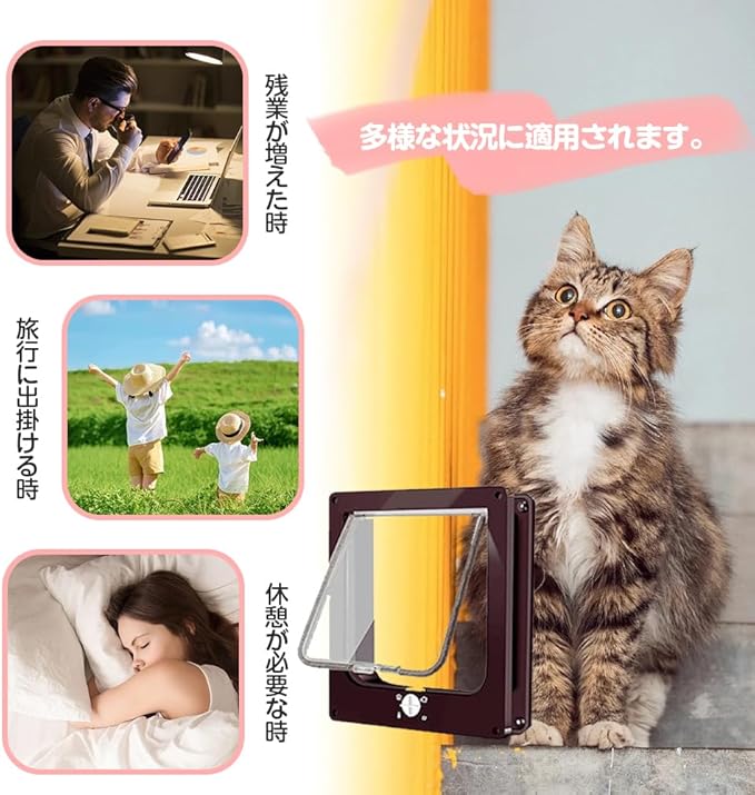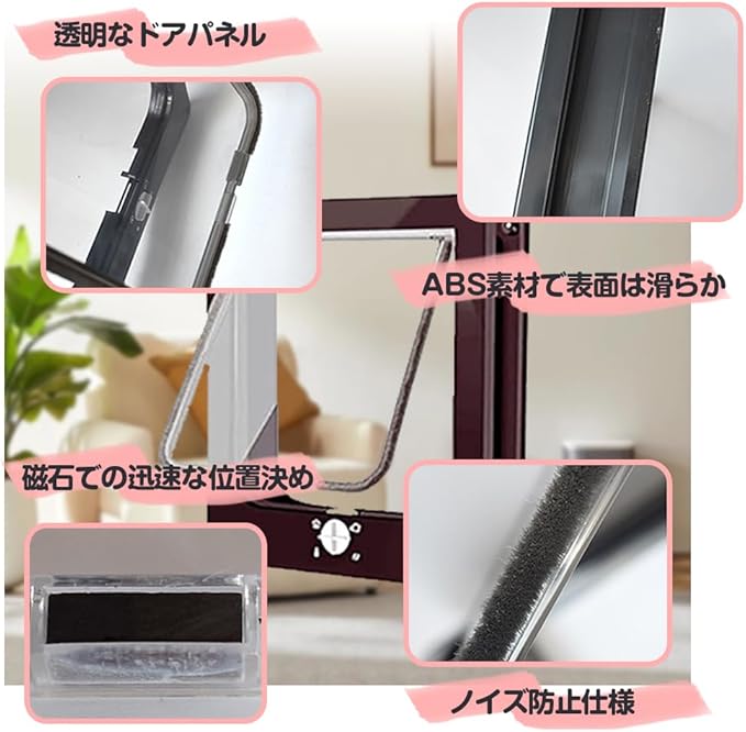 【安全性】非接触マグネットと静音ブラシの採用により、ペットが出入りする際の不快な音を大幅に軽減します。また、透明なドアパネルを通じて、いつでも外の様子を確認できるため、ペットにとっても安心できる設計です。