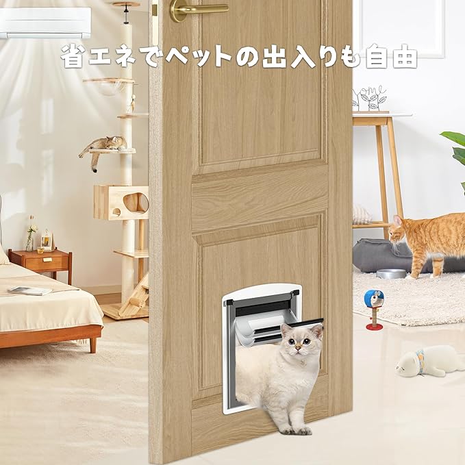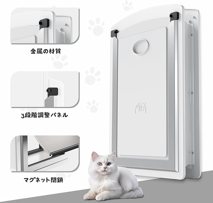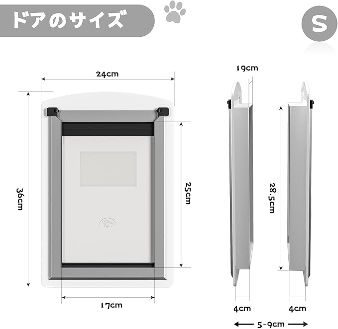 【中小型ペットに対応|伸縮トンネル設計】この猫用・小型犬用ドアは、最大7kg程度の猫に適しています。約4〜8cm厚のドアに対応する伸縮式トンネル構造を採用。フレームサイズ:約24 36cm、フラップサイズ:約17 24cm。