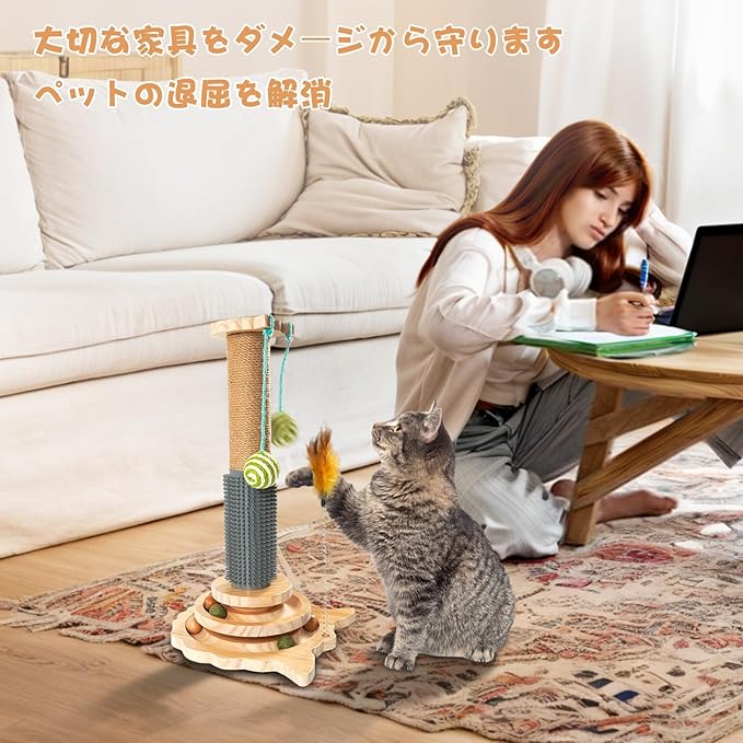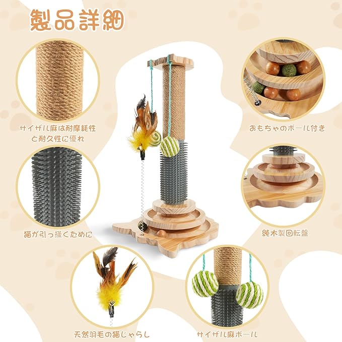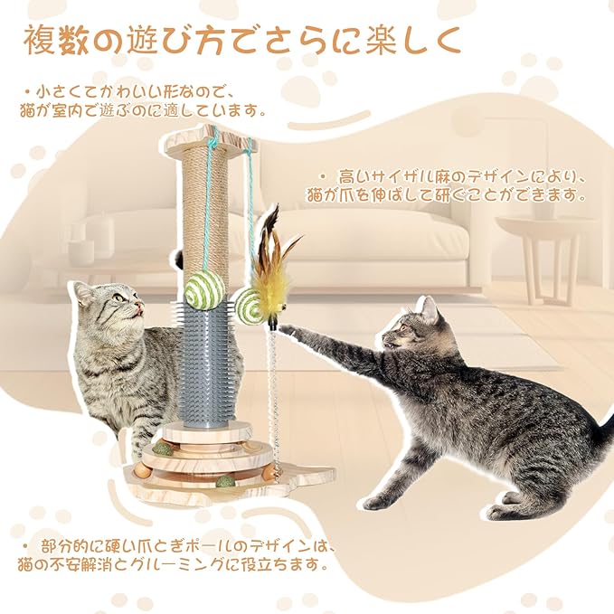 【猫のお気に入りのおもちゃ】:猫は爪研ぎポールを使って引っ掻いてストレスを軽減し、爪を研ぐことができます。回転盤には猫が遊べるおもちゃのボールが付いています。