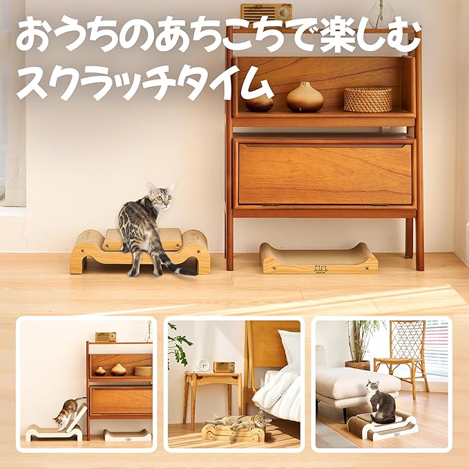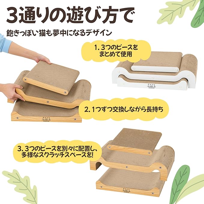 【3つのピースで多彩な使い方】 3つの別々のピースで構成され、猫ちゃんの好みやお部屋のレイアウトに合わせて多様な使い方ができる爪とぎです。3つの爪研ぎピースを一か所に設置するもよし、1つずつ交換しながら使うもよし、お部屋の各所に配置して猫ちゃんにとっての楽しい爪とぎスポットを作ることも可能です。家具などを猫の爪から守りながら、猫ちゃんのストレス解消もできる爪とぎです。