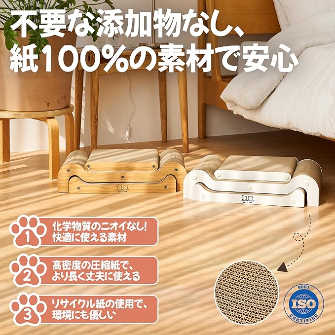【安心な100%段ボール素材でこだわり抜いた品質】 猫ちゃんが直接触れるものだから、安心な100%段ボール素材を使用。化学物質による変な臭いがなく、猫ちゃんが安全・快適につめとぎタイムを楽しめます。猫ちゃんのカラダが直接触れるつめとぎだから、品質にとことんこだわり抜いた自然素材で安心な爪研ぎです。