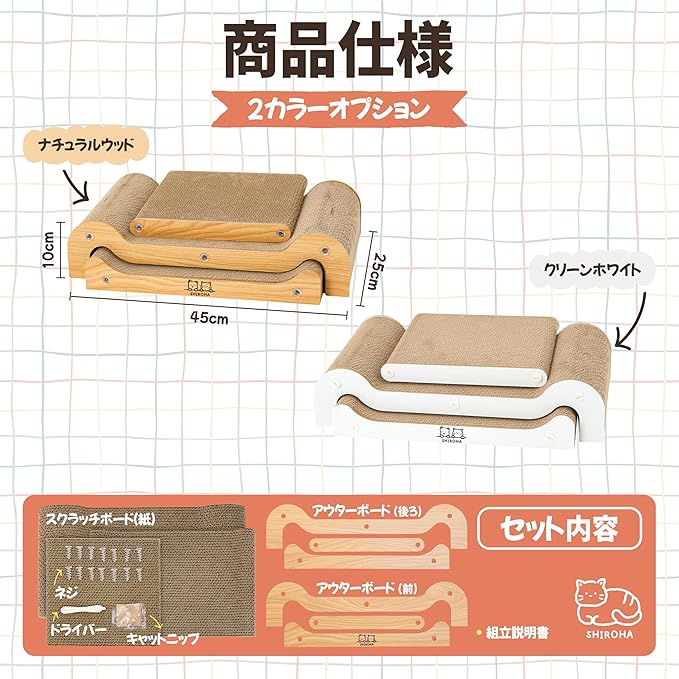【お部屋の雰囲気を上げる洗練された2カラー】 インテリアや猫の毛色に合わせて選べるカラーオプションの爪研ぎ。温かみのある自然なナチュラルウッドトーンの爪とぎと、どんなインテリアにも合う清潔感のクリーンホワイトの爪とぎ、2色からお選べます。インテリアを邪魔せず、むしろ雰囲気を上げてくれるデザインでお部屋に自然に溶け込む爪研ぎです。