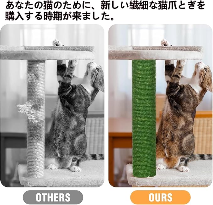 耐久性良い:他の爪とぎポールより、厚さ3mmの紙管と直径3.5mmのサイザル麻紐で作た当製品はもっと丈夫で長持ちします。