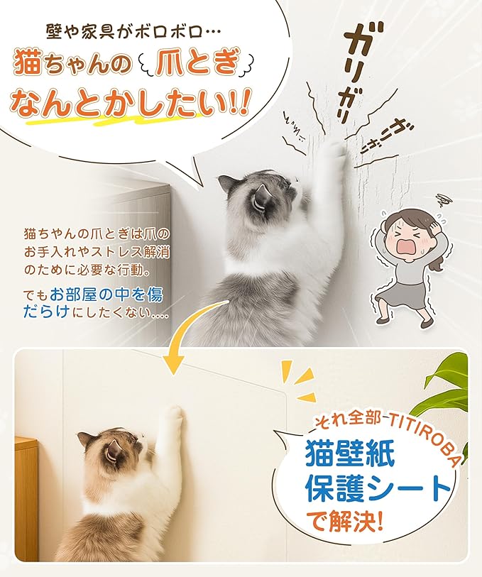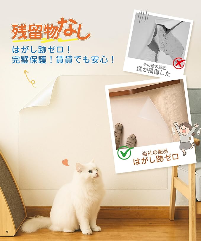 【強化素材・猫の爪に強い】厚みのある強化素材で作られた爪研ぎ防止シートは、耐久性があり破れにくい設計です。活発な猫が爪を研ぐ行動にも耐えるため、壁や家具を猫の爪から確実に保護します。