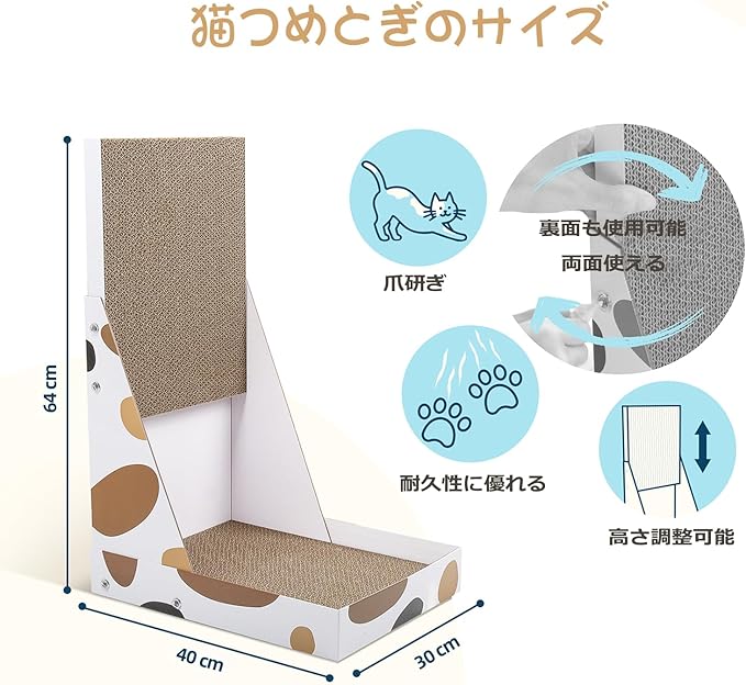 【安全な素材】猫つめとぎの素材は無害な高密度ダンボール素材を使用しています。丈夫で長持ちするので経済的です。両面使用可能なので、長く使えてでコスパも抜群です。壁にもシールで固定することができるので、安定して爪とぎをすることができます。