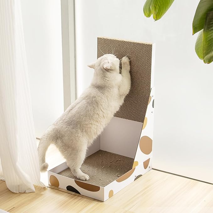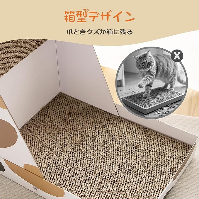 【L字型の爪とぎ】猫つめとぎの壁や柱で詰めを研ぐのが好きな子もさまざまな姿勢で快適に爪研ぎできる設計です。猫つめとぎの下が箱型になっているので、箱好きの猫ちゃんにはぴったり。安心してくつろぐことができます。