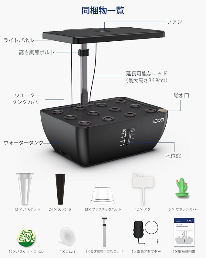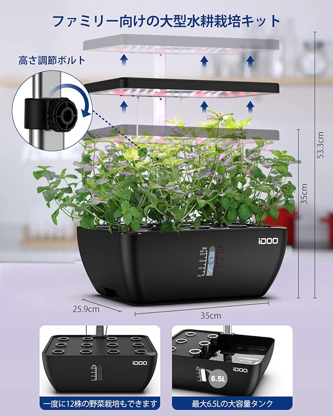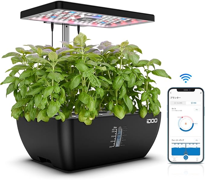 iDOO 水耕栽培セット 水耕栽培キット 野菜栽培セット Wi-Fi アプリ対応 遠隔操作 室内 おしゃれ 家庭菜園 観葉植物 自動散水 プランター 植木鉢 発芽 インテリア 菜園 苗 果物 野菜 植物育成LEDライト 自動水循環システム搭載 ランプシェードの高さ調節可能 同時に12株野菜栽培可能 ※がRENPHO JAPAN以外の商品は保証対象外です | KAZESHOP