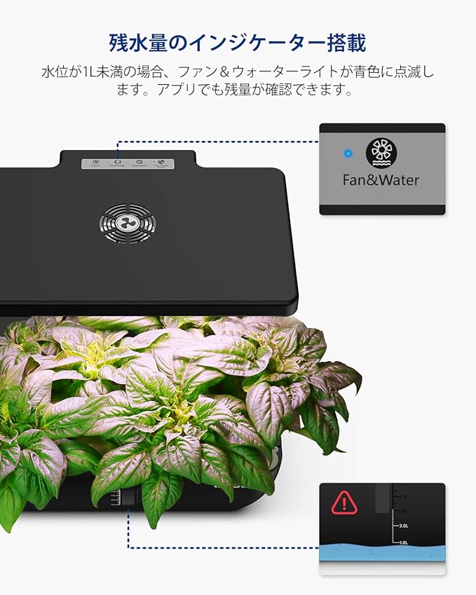 ▶残水量のインジケーター搭載◀タンク内の水位が1L未満になった場合、コントロールパネルのFan&Waterインジケーターライトが青色に点滅し、アプリのウォーターポンプアイコンも青色からオレンジ色に変わり、「時間内に水を追加してください。」というヒントも表示されます。植物がより良い成長をするためには、定期的に水位窓を確認し、減っている場合は給水してください。