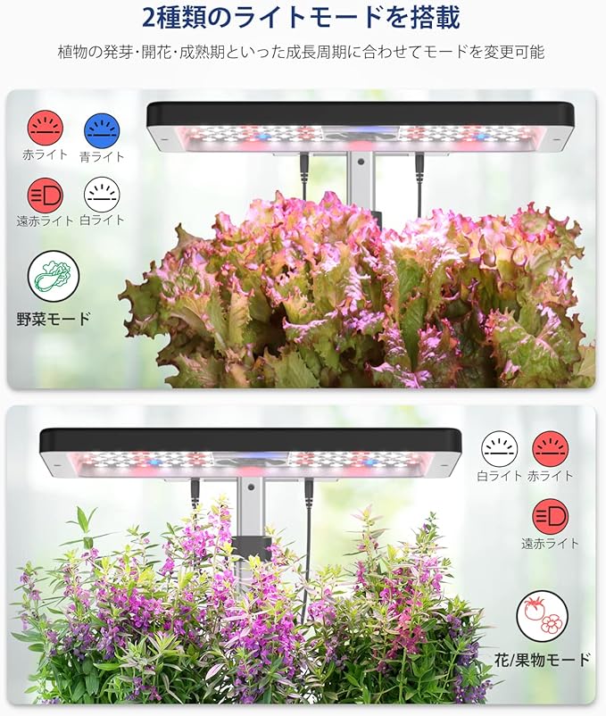 【安心の総合ヘルスケアブランド】1) 「iDOO」は、総合ヘルスケアブランド「RENPHO」のサブブランドです。 2) アメリカアマゾンのトップセラー、大人気のヘルスケアブランド。 3) 全商品メーカー保証1年、安心の日本人スタッフによるサポート。▶野菜モードと花&果物モード◀植物の種類によって、2つのLEDライトモードを設定可能です。野菜モードは収穫物が葉菜類の植物に使用します。生命力が強い植物は果物モードを選びます。2つのモードは簡単に切り替え可能です。また、ライトが睡眠に影響を与える場合は、野菜モード/花&果物モードボタンをもう一度押すとオフになります。10時間後に自動的にライトが作動します。電源をオフにした後に電源の入れ忘れを防止し、長期間経った後にライトを再びオンにするのを忘れても植物を保護するように設計されています。
