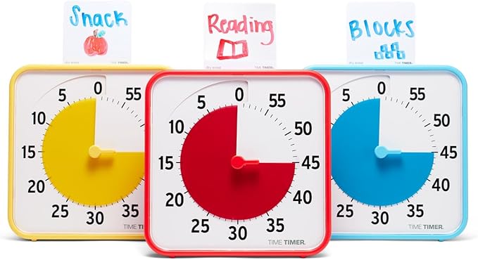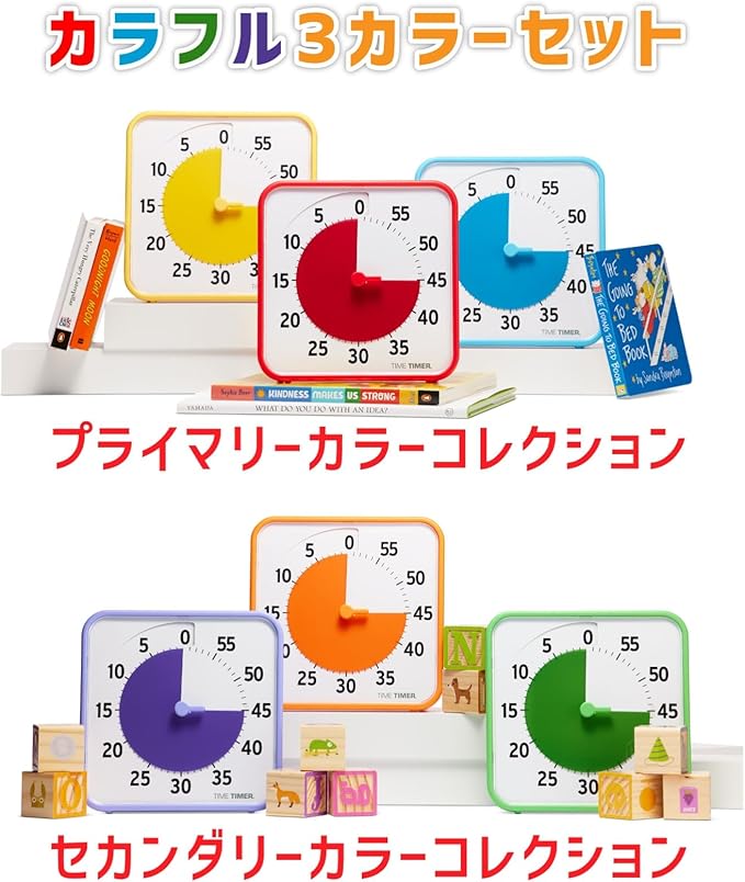 黒と赤を基調としたタイムタイマーオリジナルから色鮮やかな3色カラーセットが登場。Time Timer Learning Center Classroom Set Primary Color Collectionは、赤・黄色・水色の教室用3個セットです。