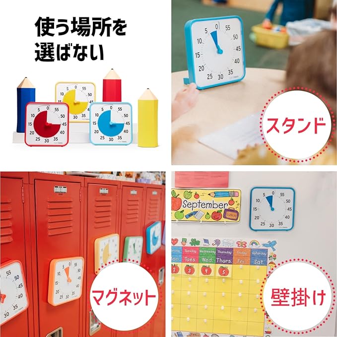 自宅や学校、オフィス等、多様なシーンで活躍するタイムタイマーは、学習タイマー・スクールタイマー・会議タイマー・ゲームタイマー・キッチンタイマーなど、勉強や仕事だけでなく、あらゆる日常(食事・支度等)のタスクタイマーとして時間を管理することができます。