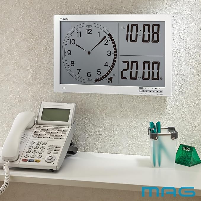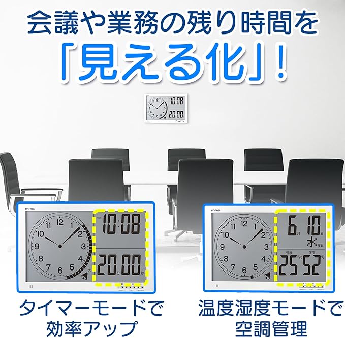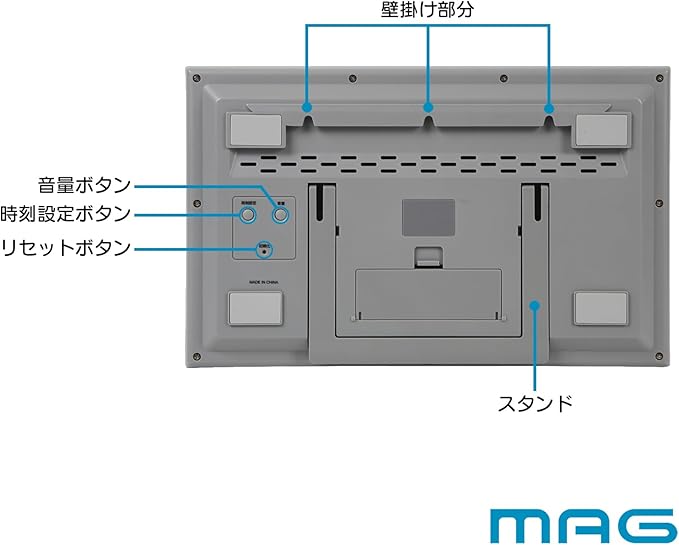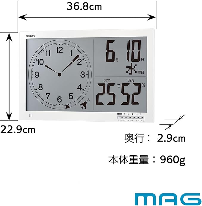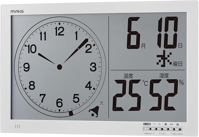 機能:カウントダウンタイマー (60分)、タイマー一時停止機能、音量切替(大・小・消音)、3分前予告アラーム機能、時計表示、12/24時間表示切替、温度表示、湿度表示、カレンダー表示 (タイマー表示切替)、時刻オン/オフ機能、環境目安表示 (インフルエンザ・熱中注意)、マグネット、置き掛け兼用