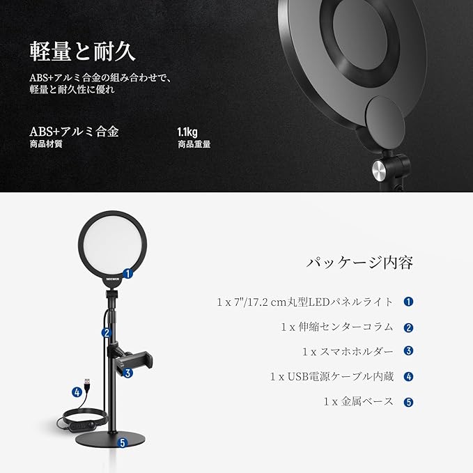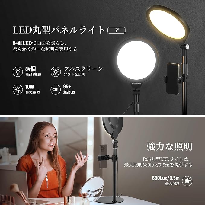 【7インチLEDパネルビデオライト】NEEWER R06小型卓上リングライトは、84個のLEDを搭載し、最大照度680lux/0.5m、3000K-6500K色温度、CRI>95を提供します。ウェイトベースと伸縮式センターポールにより、高さ調節が可能です。また、スマホホルダーが付属しており、コンパチブル iPhone、化粧照明、自撮り、Tiktok/Youtubeビデオ録画、ポッドキャスト、Facetime、Zoom通話、ビデオ会議、生放送、Vlogging、撮影などに最適です。