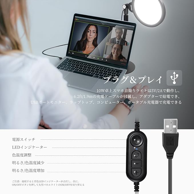 【USB電源充電】10W卓上スマホ自撮りライトは5V/2Aで動作し、6.2ft/1.9mの充電ケーブルが内蔵されており、アダプタから給電したり、USBポートディスプレイ、ノートパソコン、コンピューター、またはポータブル充電器を介して充電したりすることができ、一日中途切れない電力を確保します。ご注意:接続すると、青いLEDインジケータが点灯します。その後、ON/OFFボタンを押して、円形パネルのリングライトのオン/オフを切り替えます。