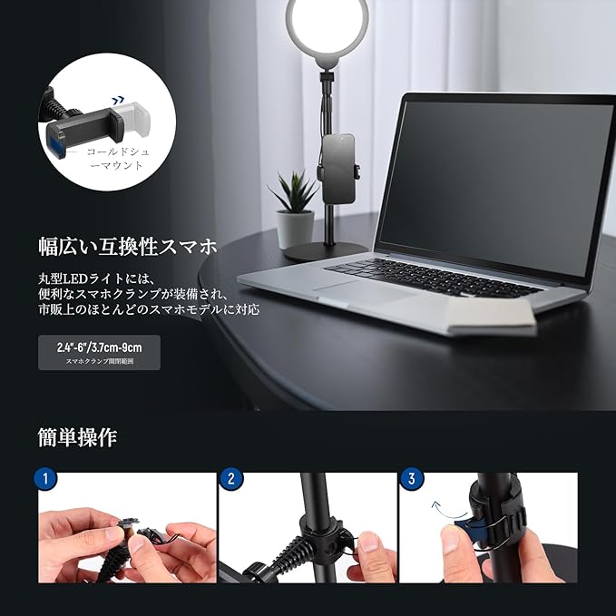 【調整可能&柔軟】スマホ用自撮りライトはクリップに取り付けると、170 チルトが可能で、ビデオ撮影やフィルライトに使用できます。三脚に取り付けると、小型リングライトは360 パン回転と135 チルト回転を提供し、高さ9cmで柔軟に使用できます。ご注意:レンズの邪魔にならないように、クリップはカメラ側の穴に取り付けてください。