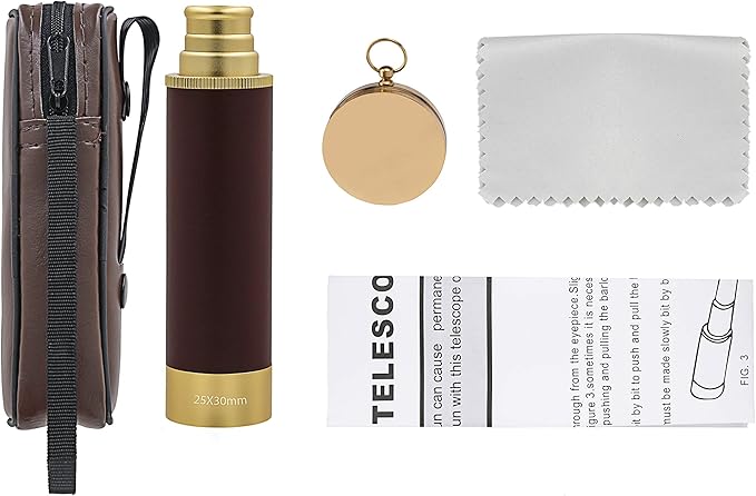 【高品質の望遠鏡】:主な部品がめっきアルミニウムで作られている。また、取っ手がハイクオリティーな革に覆われている。望遠鏡に付属する野外生存用コンパスは銅製であり、アクリルを含み、非常に精美だ。