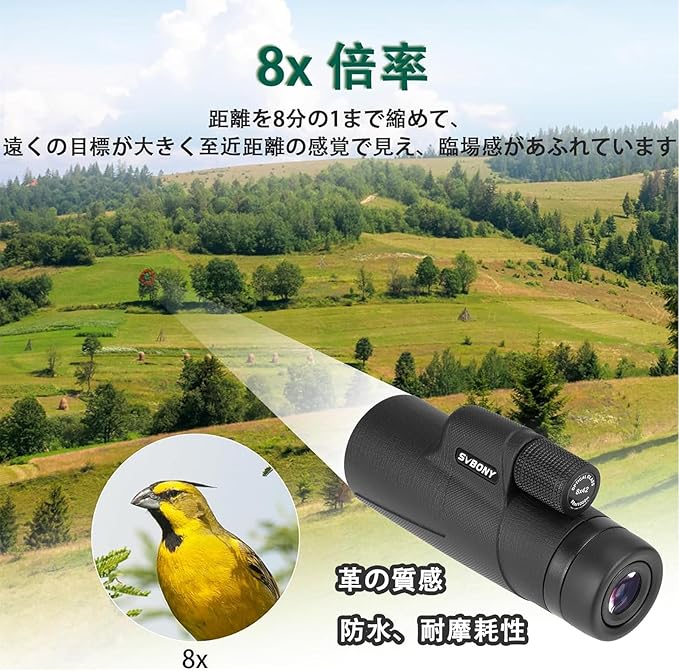 単眼望遠鏡 高倍率。8倍の倍率は距離を10分の1まで縮めて、遠くの目標が大きく至近距離の感覚で見え、臨場感があふれています。