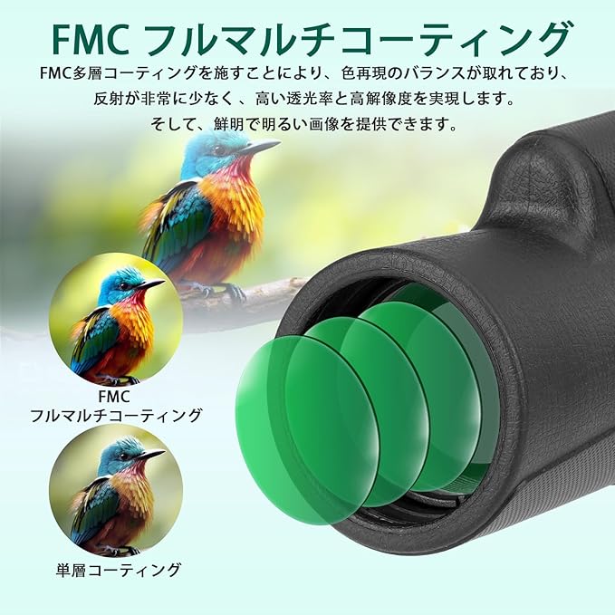 BAK-4プリズムおよびFMC フルマルチコーティング。高屈折率BAK-4プリズムの採用により、優れた光透過率を確保して色収差を最小限に抑えます。FMC多層コーティングを施すことにより、色再現のバランスが取れており、反射が非常に少なく 、高い透光率と高解像度を実現します。そこで、鮮明で明るい画像を提供できます。