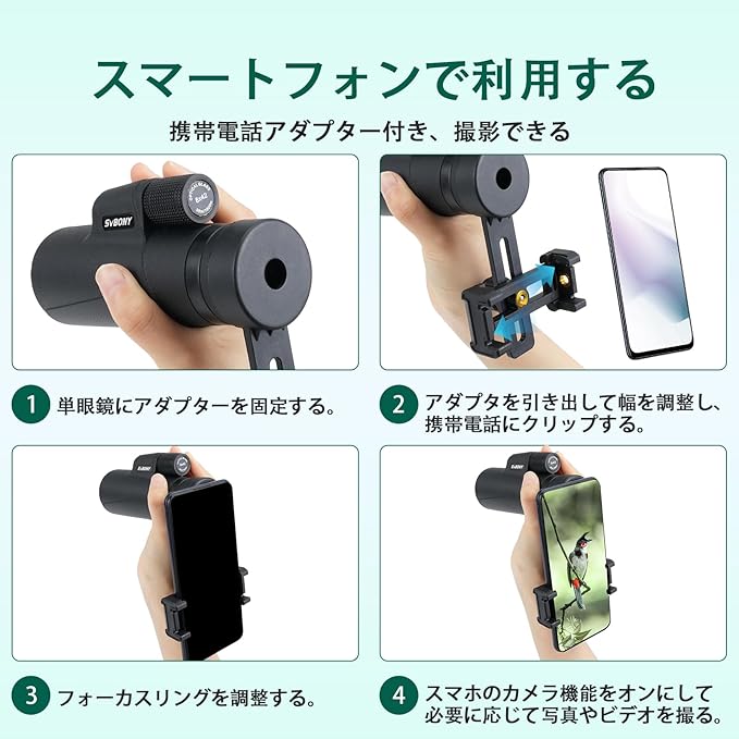 単眼望遠鏡 スマホ対応。携帯電話アダプターに接続して、スマートフォンで利用できます。撮影とビデオできます。