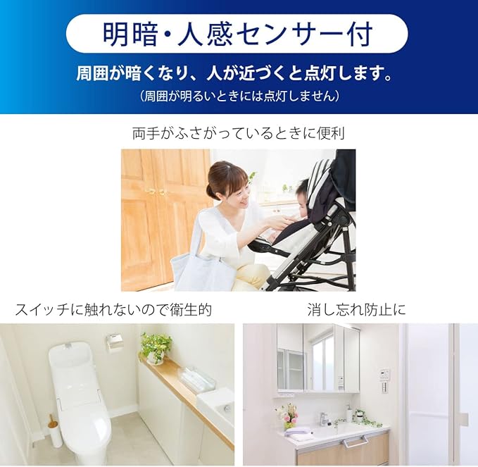 ◆両手がふさがっているときに便利 ◆スイッチに触れないので衛生的 ◆消し忘れ防止に ◆内玄関、クローゼット、洗面所にオススメ ◆全光束1400ルーメン、ボール電球100形相当の明るさ ◆点灯色は電球色