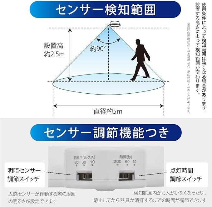 【 特 長 】 ◆コンパクトだから天井すっきり ◆周囲が暗くなり、人が近づくと点灯します。(周囲が明るいときには点灯しません。) ◆人の動きがなくなると自動消灯します。人が動くと点灯は延長されます。 ◆点灯時間が調節できます。(200秒・60秒・20秒) ◆センサーが作動する際の周囲の明るさが調節できます。(60ルクス・30ルクス・10ルクス)