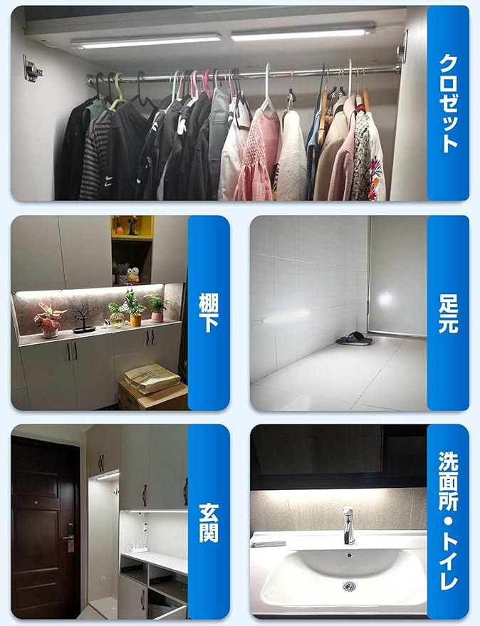 【様々な用途】手元灯、屋内、インテリア、洗面所、物置、倉庫、部屋、本棚、棚下、食器棚、足元灯、廊下、階段、寝室、天井、ワードローブ、キャビネット、収納室、洗面台など、どんな場所にも取り付けられます。