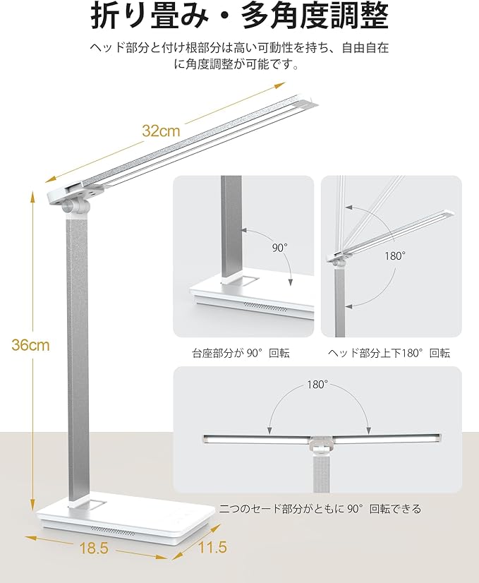 【折りたたみ式アームとダブルヘッドで自在な調整】高品質なアルミ素材を使用し、アームの角度や高さを自由に調整できるため、照明の角度をお好みで変えられます。ダブルヘッドデザインにより、広範囲に光を拡散し、デスク全体を均一に照らすことが可能です。影が気になる場面では、2つのライトヘッドの向きを調整することで、影を最小限に抑えることができます。使用後はコンパクトに折りたたんで収納でき、デスクスペースをすっきりと保つことができます。