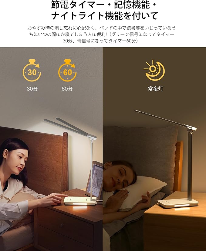 【便利なタイマー・メモリー機能とナイトライト】30分と60分のタイマー機能を備えており、設定時間が経過すると自動的に消灯しますので、消し忘れの心配がありません。記憶機能も搭載しており、前回使用時の明るさや色温度を自動的に保存しますので、再度調整する手間が省けます。ナイトライト機能は3段階の光調節が可能で、温かみのある柔らかな光が就寝時やリラックスタイムに最適です。