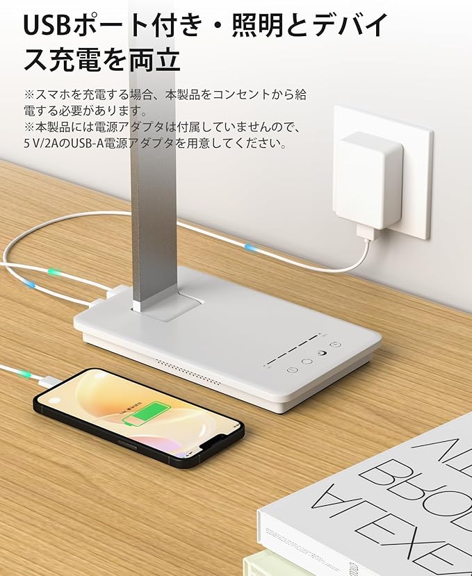 ▲ご注意ください:一般的に、LEDデスクライトが点滅したり、安定して点灯しない原因の多くは「電力供給不足」によるものです。特に、USBアダプターやケーブル、または電源コンセントの出力が不安定または規格に合っていない場合、正常に点灯しないことがございます。 そのため、5V/2Aの出力に対応したUSBアダプターのご使用を推奨しております。
