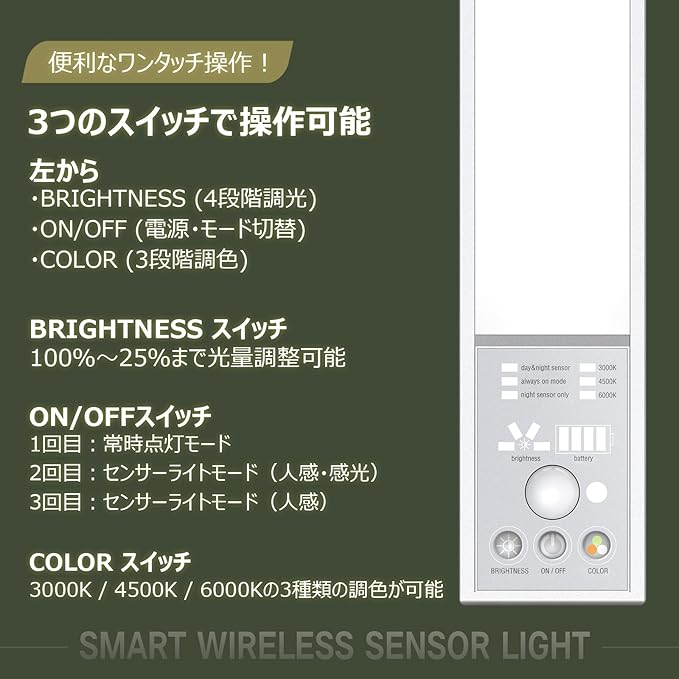 ⭐【便利なワンタッチ操作】3つのスイッチで操作可能。左からは・BRIGHTNESS (4段階調光) ・ON/OFF (電源・モード切替) ・COLOR (3段階調色)。①BRIGHTNESS スイッチ:100%~25%まで光量調整可能 ②ON/OFFスイッチ:1回目→常時点灯モード、2回目→センサーライトモード(人感・感光)、3回目→センサーライトモード(人感)③COLOR スイッチ:3000K / 4500K / 6000Kの3種類の調色が可能。