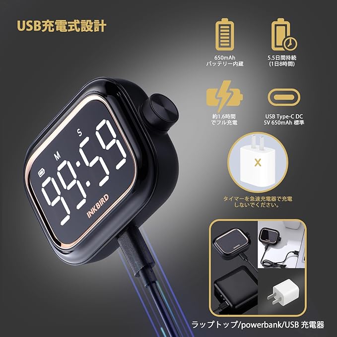 タイマー 電源USB充電式:電源 タイマー頻繁に電池を交換する必要はありません。 タイマー スイッチこのデイリータイマーは便利なUSB充電式デザインを採用しています。 ポモドーロ タイマー内蔵の 650mAh リチウム電池は、毎日 8 時間の使用で 5.5 日間連続動作でき、第 1 世代の INKBIRD タイマーよりも電池寿命が 20% 長くなります。 ストップウォッチ 卓上フル充電には約100分しかかかりません
