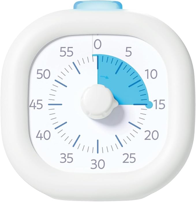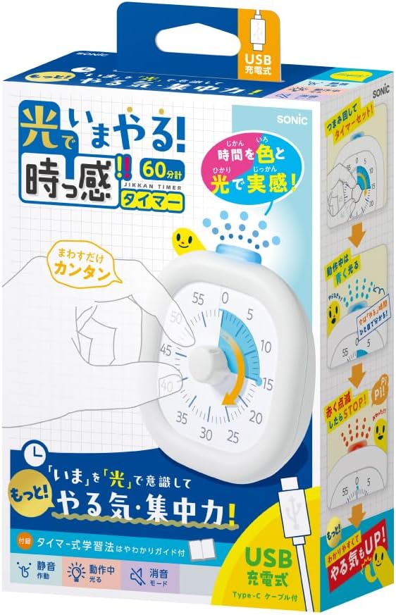 つまみを回してタイマーセット、動作中は青く点灯します。 電池のいらないUSB充電式 タイマー式学習法はやわかりガイドブック付