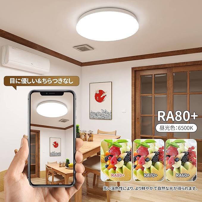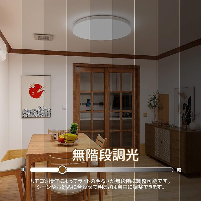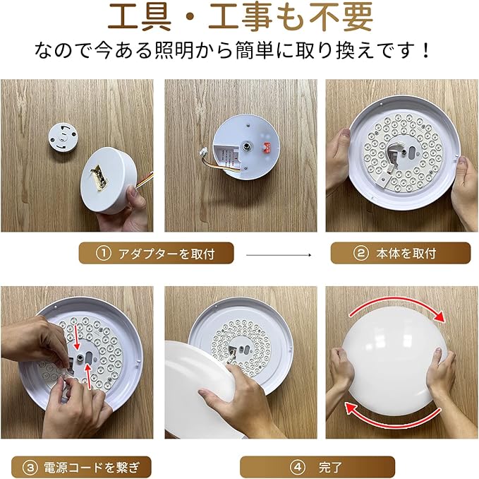 【超薄型、コンパクト設計&取付簡単】小型、薄型で収納、持ち運びが便利です、引っ越しでも負担になりません。軽くてコンパクト、アダプターと本体一体型なので、取り付け工具・工事も不要、日本語取扱説明書に記載である取付方法によって高齢者、女性でも商品簡単に取り付けできます。明かさ十分、~8畳までの部屋に適切です。リビングルーム、ダイニング、寝室、オフィス、洋室、和室、部屋、居間など様々のところで活躍られます。 ★警告:感電や怪我を防ぐため、取り付けまたは取り外しの前に必ず電源を切ってください。