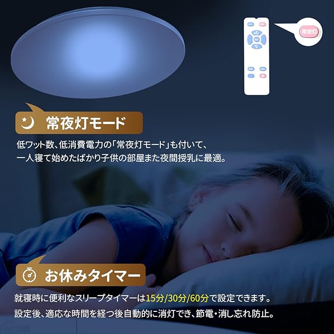 【常夜灯モード&メモリ機能&タイマー機能】普通のシーリングライトより、低ワット数、低消費電力の豆球「常夜灯モード」も付いて、うすく暗い常夜灯モードは夜間授乳や赤ちゃんのお世話に最適。便利なタイマー機能付き、30分、60分のOFFタイマーを設定後、設定時間で消灯する機能で、おやすみ時の消し忘れ防止に役立ちます。また、メモリ機能が付いて、リモコンでメモリ機能はお好みの明るさを記憶して、再開する時、わざわざ調節必要がなくて。