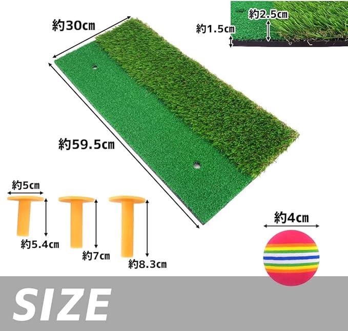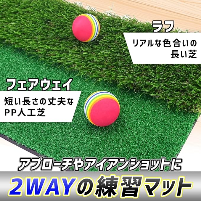 届いたその日からスイング練習できるゴルフマットです。ラフ芝とフェアウェイの2種類の芝生を揃えているため、状況に応じた練習が行えます。