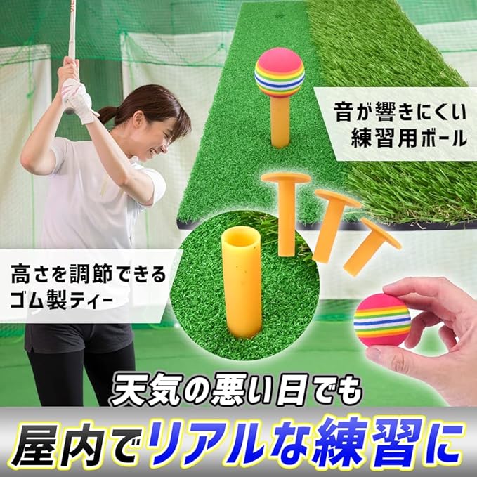 マットにはアイアンショットやドライバーショットも練習できるゴムティー専用の穴が開いています。高さを調節できるよう3種類のゴムティーをご用意致しました。