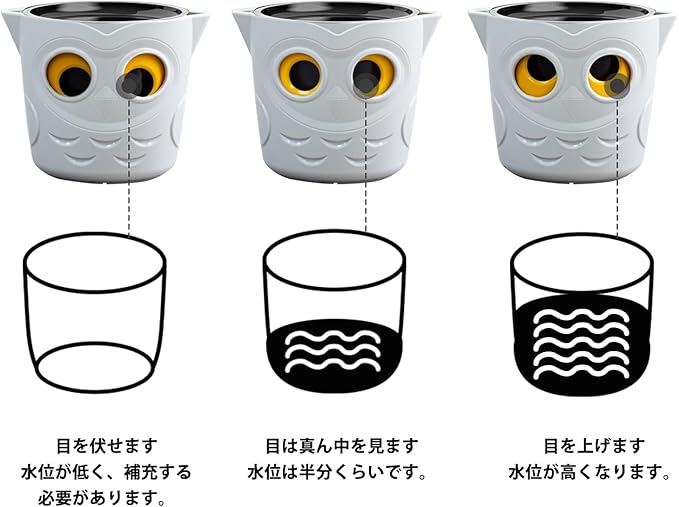 直感的な水位計: フクロウの目のフローマークが水位を示します。 (楽しい) – 水位が高くなります。 目を伏せます(悲しい) - 水位が低く、補充する必要があります。