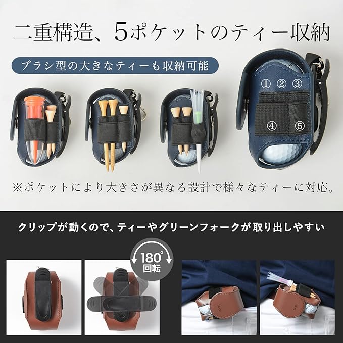 【様々太さ、大きさのティーに対応】 二重構造のティーポケットは、大きさの違う5つのポケットを内蔵。大きさ、太さの違う様々なティーの収納が可能です。幅の大きなブラシ型ティーも入るので、これ1つで必要なティー全てを持ち歩けます。