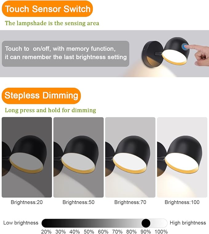 【タッチ調光&ON/OFF】タッチでON/OFF、メモリー機能付き調光式LED壁掛けライト、最後の明るさ設定を記憶することができます。長押しで調光、20%-100%の調光範囲を自由に調整し、お好みの効果に到達します。外部スイッチを必要とせず、明るさを調整するのにとても便利です。