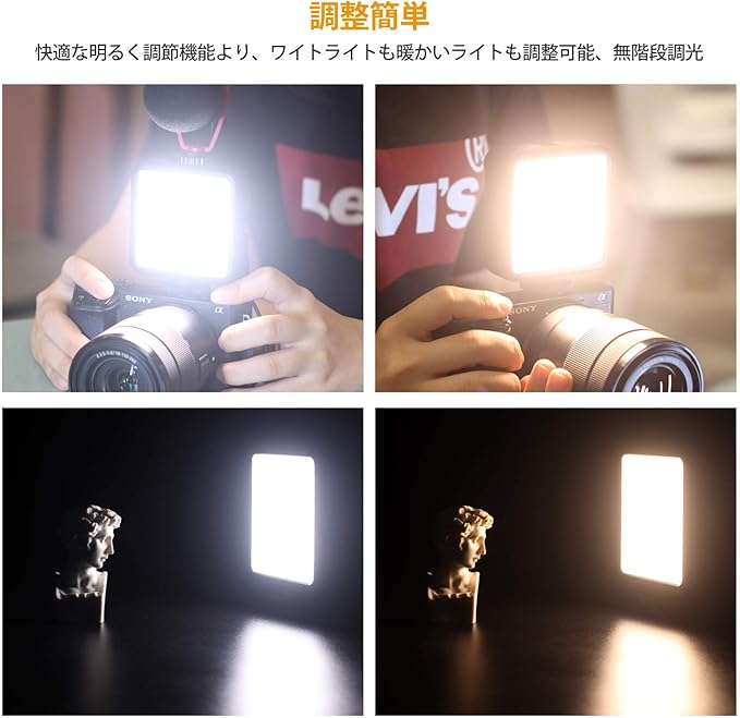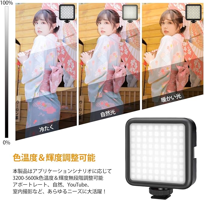 【3200-5600k無段階調光可能】41の白い光ビーズ+ 40の暖かい光ビーズの組み合わせ、アプリケーションシナリオに応じて色温度および色バランス、明るさなどをスイッチ一つで調整でき、3200Kから-5600Kまで無段階の色温度制御を可能です。アポートレート、自然、YouTube、室内撮影など、あらゆるニーズに大活躍!