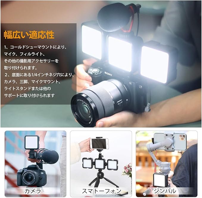 【幅広い交換性&マルチマウント】 LEDビデオライトは、3つのコールドシューマウント(上部に1つ、側面に2つ)で設計されており、マイク、フィルライト、その他の撮影用アクセサリーを取り付けることができます 。複数のライトパネルも接続でき、照明の明るさを強化し、照明効果を向上させます。それに、アクセサリーシューと底面にある1/4インチネジ穴を使って、カメラ、三脚、マイクマウント、ライトスタンドまたは他のサポートに取り付けられます。