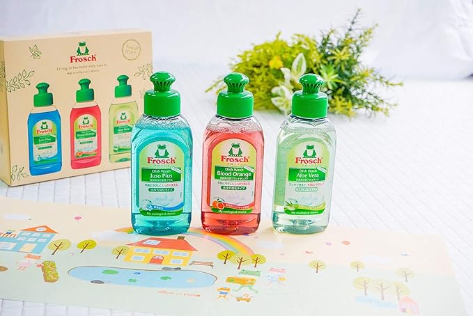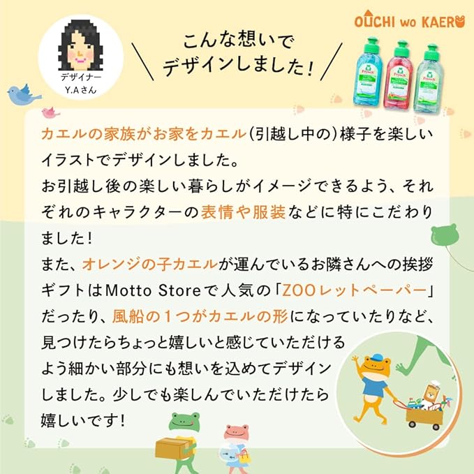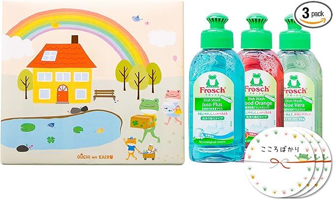 環境に優しい洗剤ドイツ生まれの「フロッシュ」が3本(各100ml)も入ったギフトセットを、可愛いカエルの包装紙で包みました!商品名の「おうちをカエル」、包装紙はカエルが引越しをしているイラスト、そして中身はカエルのロゴが印象的なフロッシュとすべてがつながっていてユーモアある、嬉しいギフトです♪