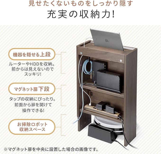 【 ルンバ基地 】ロボット掃除機を下部に設置することが可能です。今までデッドスペースになっていたロボット掃除機の上の空間を収納スペースにすることが出来ます。(ロボット掃除機を収納することはできません。また、ルンバのクリーンベースには対応しておりません。)