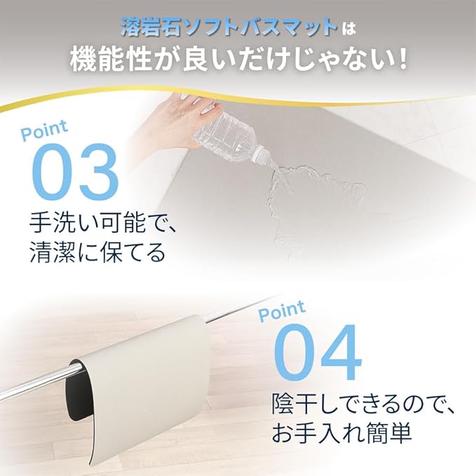 【機能性だけじゃない!使いやすさへのこだわり】 滑りにくい裏面: 裏面は天然ゴム製のため、お風呂上がりの濡れた足でも滑りにくく安心。 手洗いOKでお手入れ簡単: 汚れたら手洗い可能なので、いつでも清潔に保てます。硬い珪藻土マットのように削ったり、乾燥に時間がかかったりする手間がありません。 陰干しOK: 毎日のお手入れは陰干しするだけでOK。特別なメンテナンスは不要です。